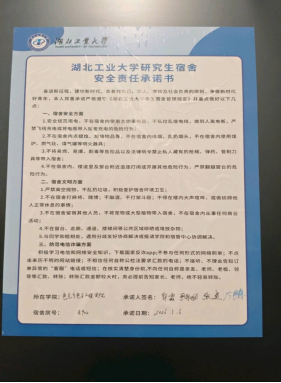 本次检查旨在强化学生的安全意识,预防各类安全事故的发生。检查组深入每一间研究生宿舍,仔细检查了宿舍内务卫生、用电规范、消防设施配备及完好情况,检查重点明确指向违规电器的使用。检查过程中,老师们与同学们亲切交流,详细讲解宿舍安全规章制度,强调违规电器使用的潜在危险,并给走访的每间宿舍发放《湖北工业大学研究生宿舍安全责任承诺书》,要求宿舍全体成员认真学习。