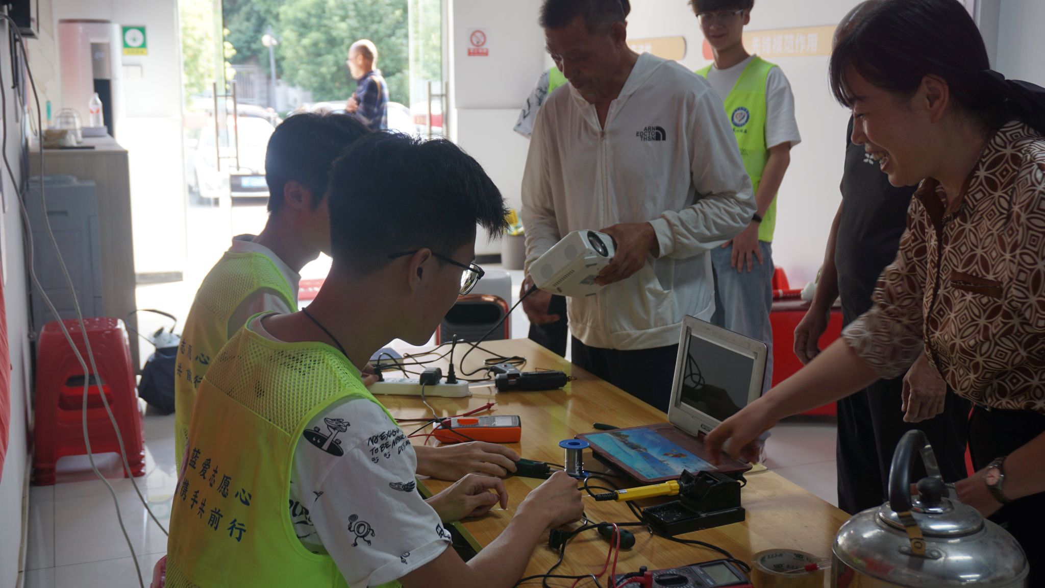 志愿加持科普,共筑心灵港湾。炎炎夏日,蓝电中心的师生们分为两队前往襄阳市刘集街道魏庄社区和武汉市湖工社区开展家电维修义务科技活动,他们有的为行动不便的老人提供免费的上门维修服务,还借此机会向居民普及家电安全使用知识,增强社区居民的日常生活科技素养。此外,蓝电中心前往襄阳市的小分队还特别安排了走访关怀刘集街道养老院的活动,为老人们送去温暖与关爱,用实际行动践行社会责任,让科技之光温暖人心。