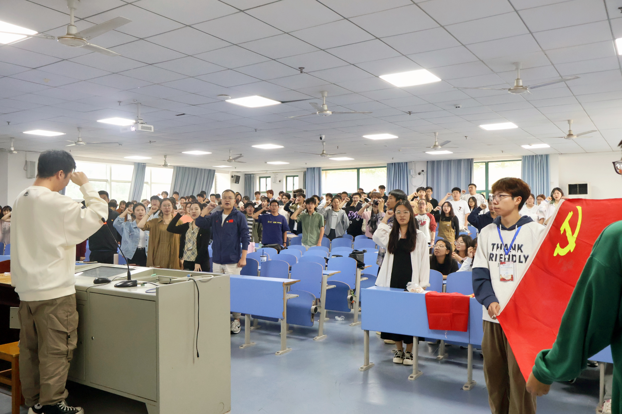 活动伊始,各学生党支部负责人首先宣读新发展入党名单,集体在党旗下宣誓,并由各学生党支部书记进行寝室授牌,新发展党员们庄重地接过授牌,他们的寝室将成为榜样示范的窗口,激励广大同学积极向上。