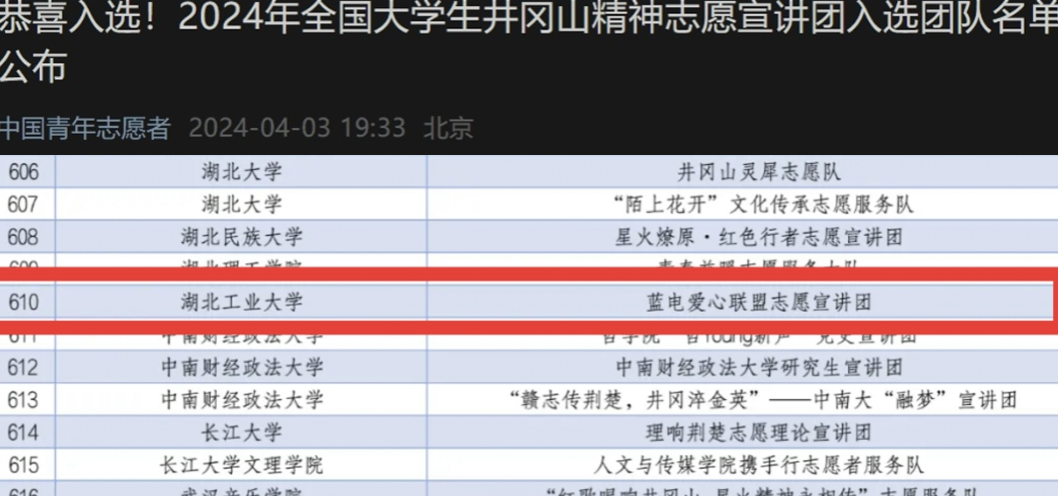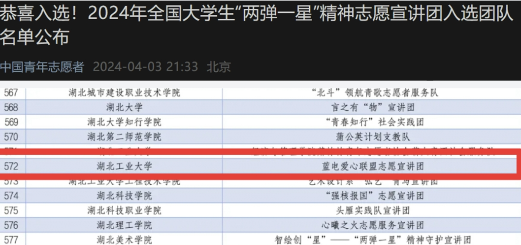 此次活动一经发出便受各方关注,经主办方审核诸多材料,最终从全国882所高校(井冈山精神)以及870所高校(“两弹一星”精神)各遴选出1000支大学生志愿服务团队。湖北工业大学电气与电子工程学院蓝电爱心联盟荣幸同时入选2024全国大学生井冈山精神志愿宣讲团和“两弹一星”精神志愿宣讲团。