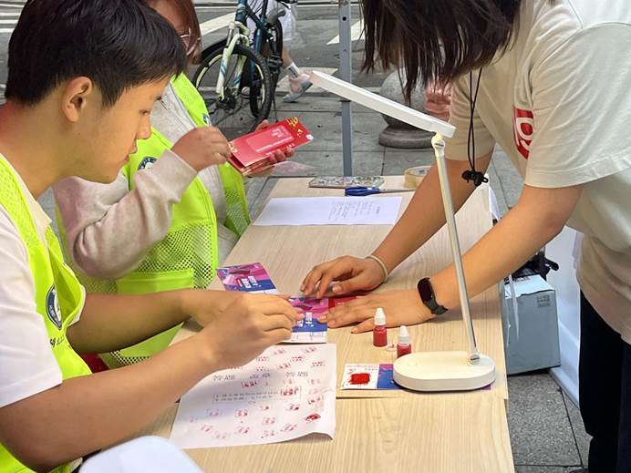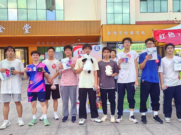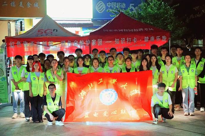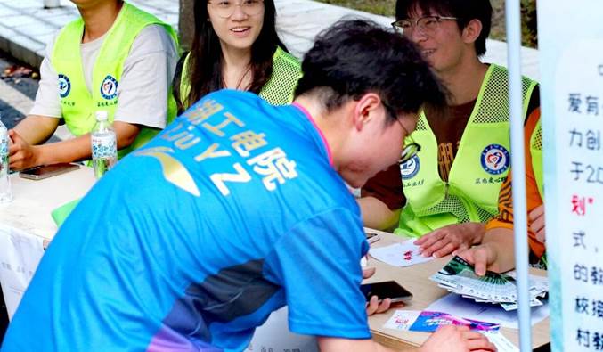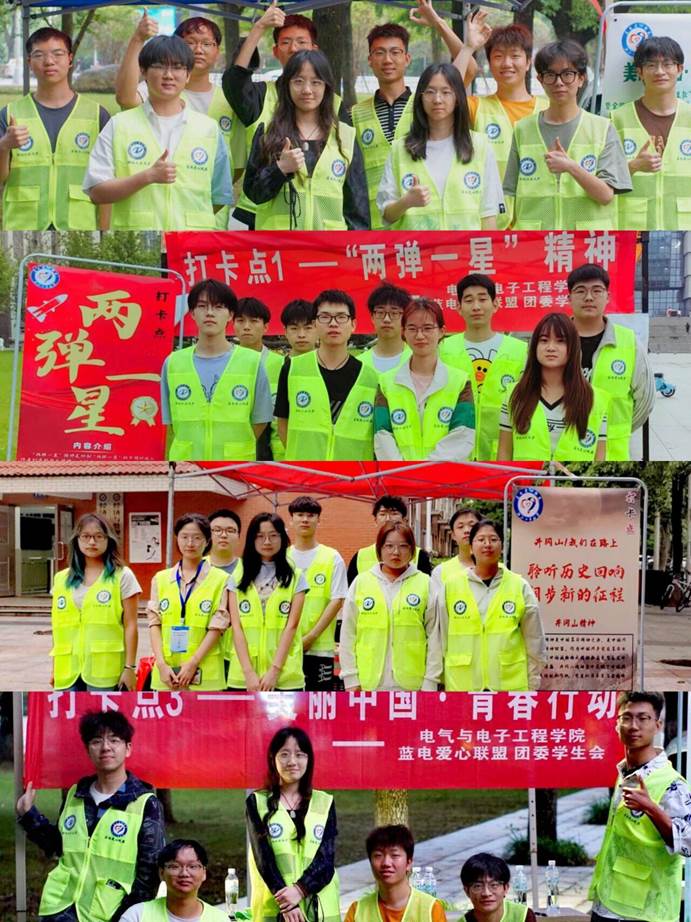 电气与电子工程学院蓝电爱心联盟联手学生会、分团委,在校园内布置四处打卡点,分别为“两弹一星”精神打卡点、“井冈山精神”打卡点、“绿色环保,助力乡村教育”打卡点、总服务台打卡点。参赛选手到达相应打卡点后需要答对三道与打卡点主题精神相关的知识问答题来获得盖章,集满打卡点印章即可兑换奖品。每个打卡点志愿者们在打卡点及跑道沿途提供志愿服务、提供物资,为同学们保驾护航并记录下许多美丽瞬间。