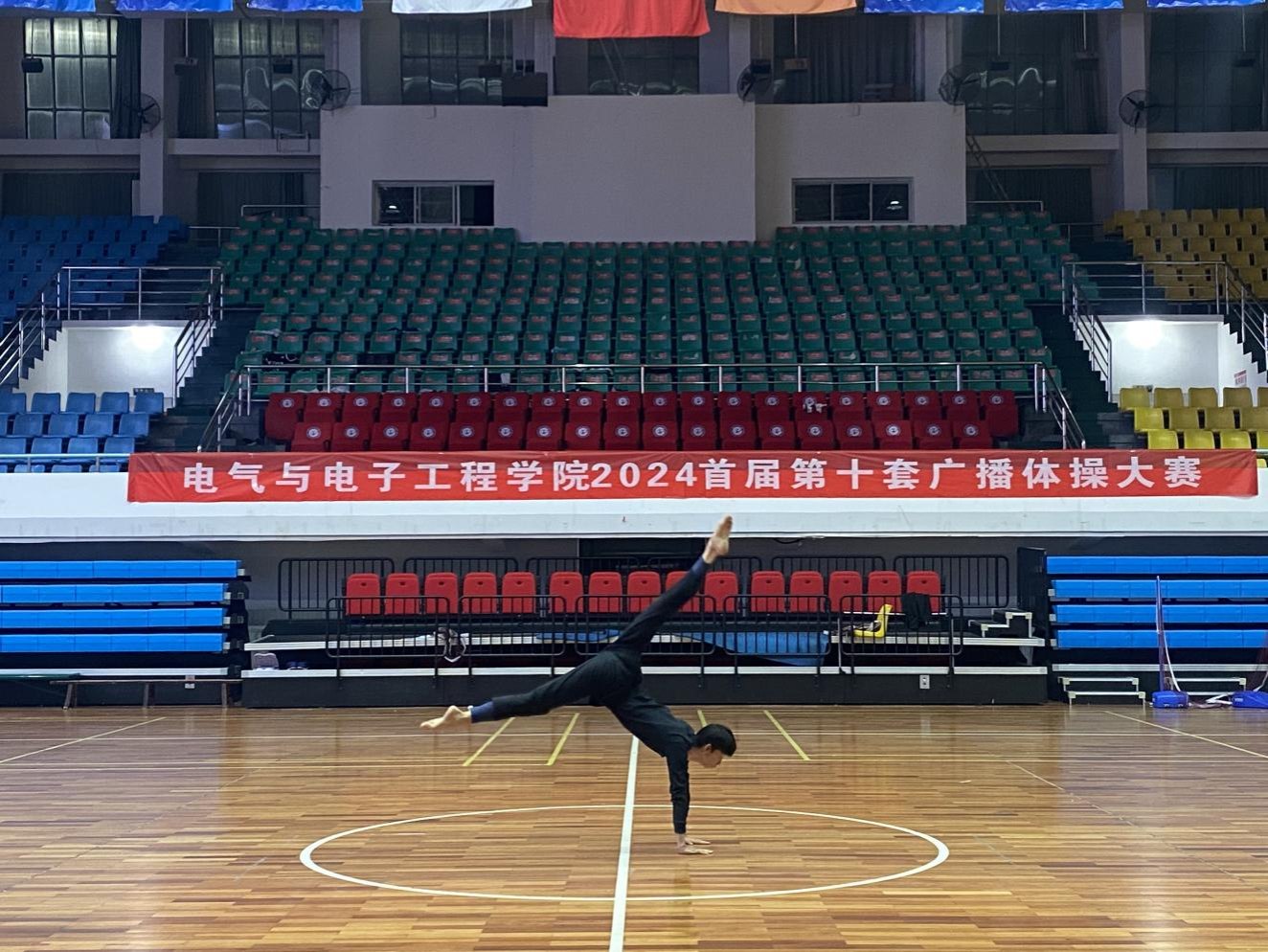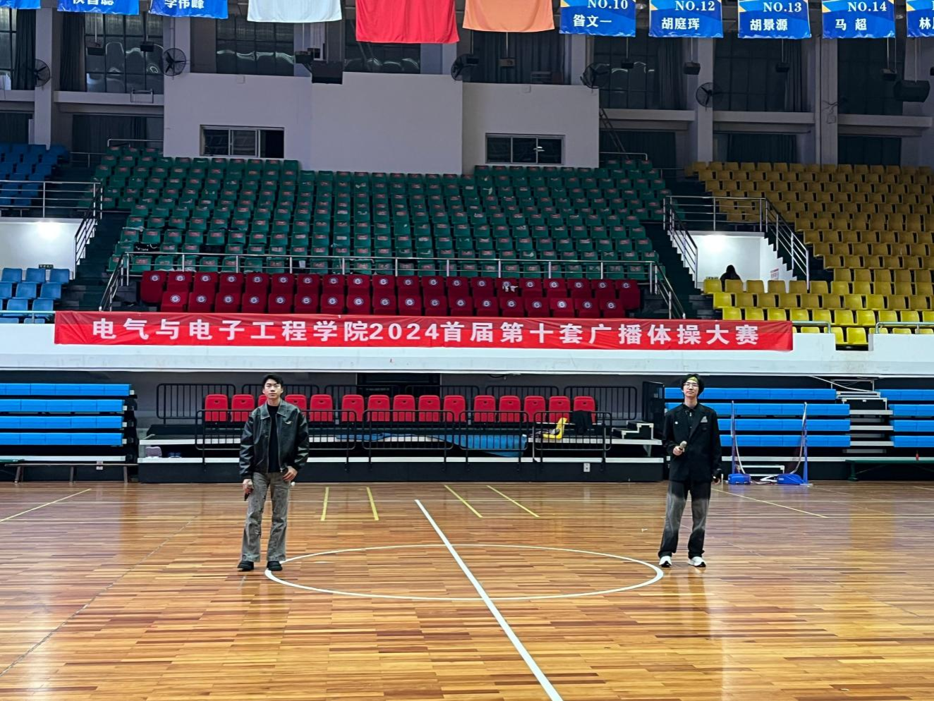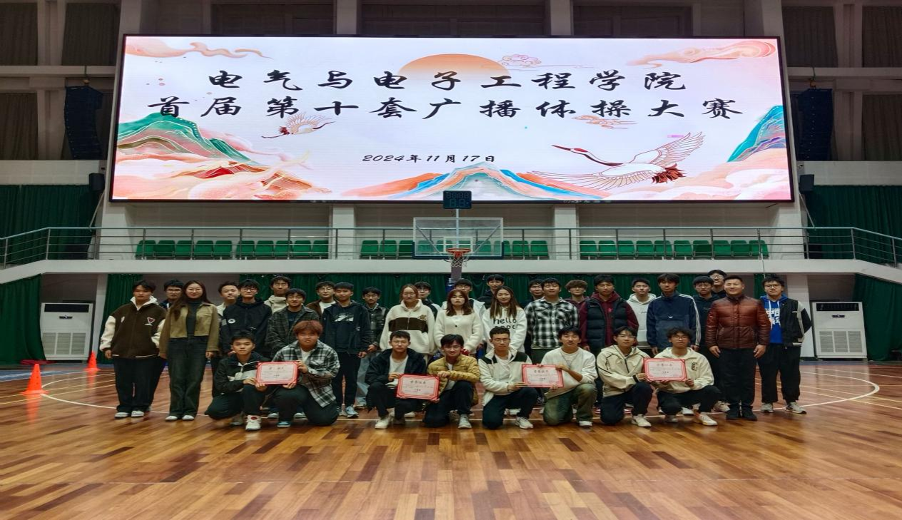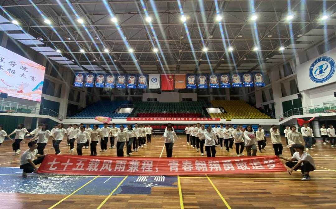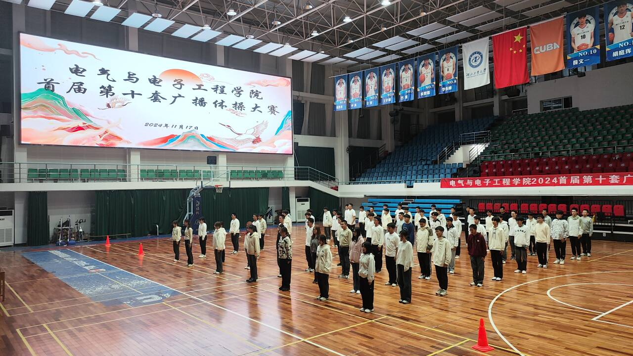 2024年11月17日晚,电气与电子工程学院在体育馆隆重举行了首届第十套广播体操比赛。2024级新生经过一个月的刻苦训练,共计504名学生同台竞技,充分展示了15个班级的团结精神和青春活力。