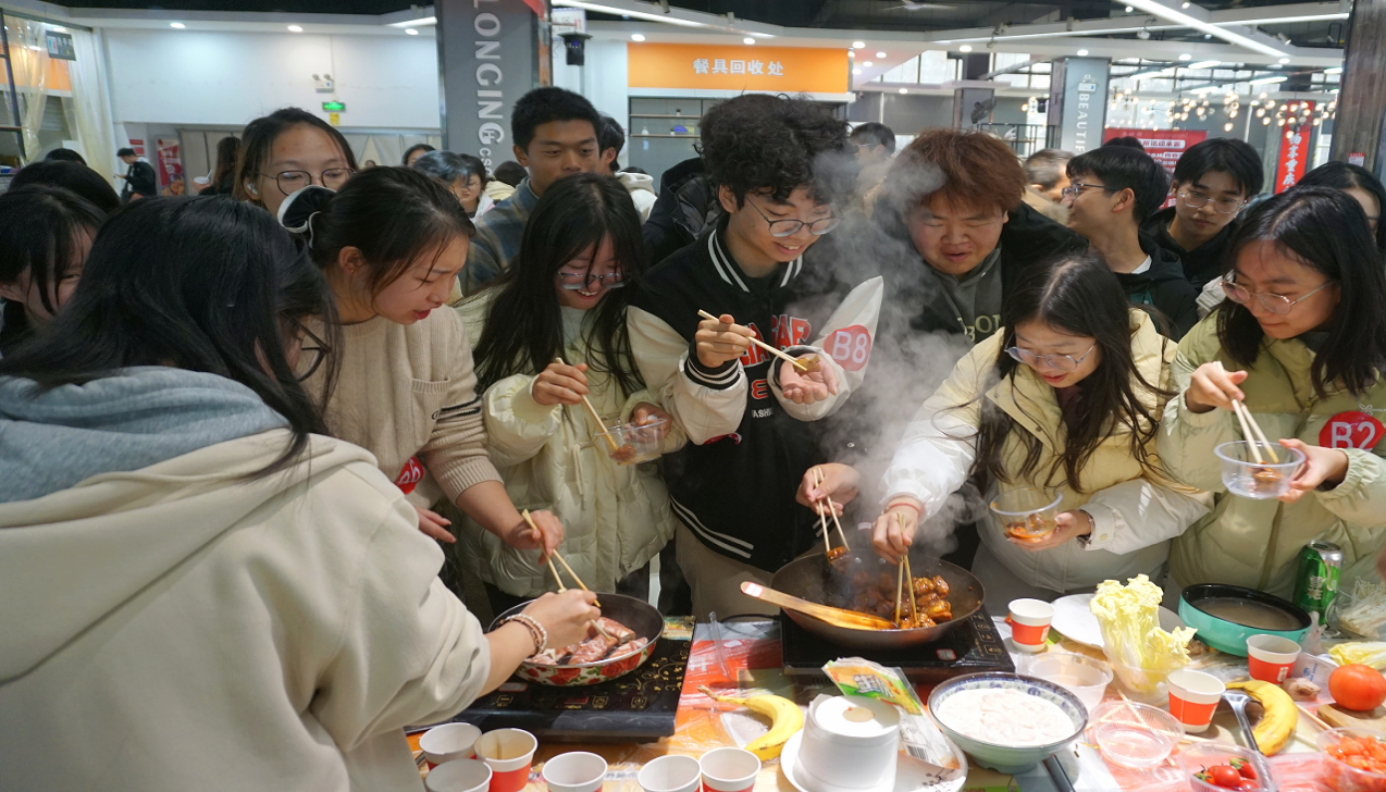 焖排骨、川香回锅肉、虾滑紫菜鸡蛋汤等一众家常菜,虽平平淡淡,背后却是每一个家庭的幸福回忆,不禁让身处他乡求学的同学们回想起那时家中的味道,此刻在湖北工业大学他们就是一家人!