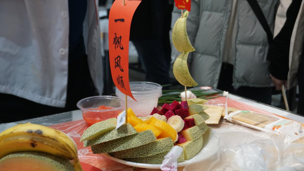 “财神驾到”“恶龙咆哮”“柚梦雀舞”...A组选手们的菜名中交织着质朴与华丽,其中刘祎涵、徐凯栋的作品“一帆风顺”,一艘由哈密瓜、火龙果、香蕉等水果拼成的帆船,精心雕琢,独出心裁,引得众多观众围观,实属本赛的一大亮点。