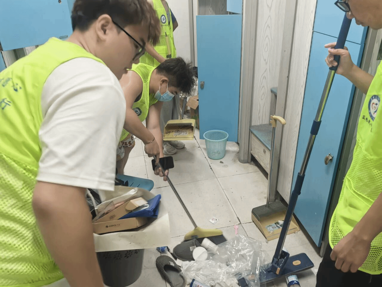 报到前一周,学院便组织志愿者开启“宿舍焕新行动”:他们身着荧光绿志愿服,分工明确、协作高效——有的手持扫帚、簸箕细致清理宿舍角落堆积的杂物,俯身清扫时连缝隙里的灰尘都不放过;有的蹲在地上分类整理垃圾,将废弃物品与可回收物一一区分;还有的逐间擦拭桌椅、检查床铺清洁度,甚至拿着手电筒查看床底是否有卫生死角。对公共区域的深度保洁更是一丝不苟,从走廊扶手到楼梯间,每一处都被擦拭得一尘不染。有热心的志愿者与我们分享:“提前把宿舍打扫干净,就是想让新生一进门就感受到家的温暖,这也是我们劳动育人的第一步。”