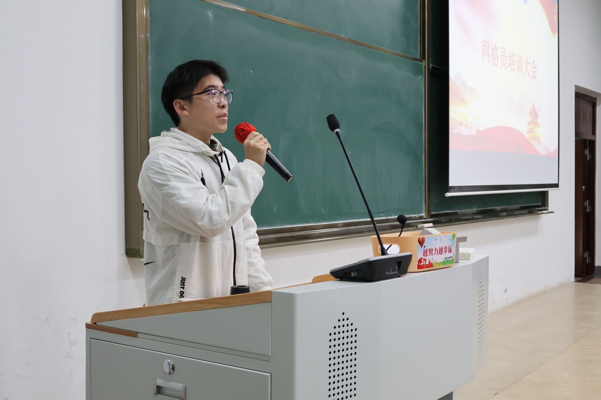 授牌仪式后,网格员培训大会启动。郑锲老师围绕网格员设置目的、职责、选聘条件及考核机制展开培训,强调网格员工作对校园安全的重要性,网格员认真学习记录。大会还表彰 2024-2025 学年优秀网格员,冯子翔、罗利豪等获表彰,郑锲老师为其颁奖。
