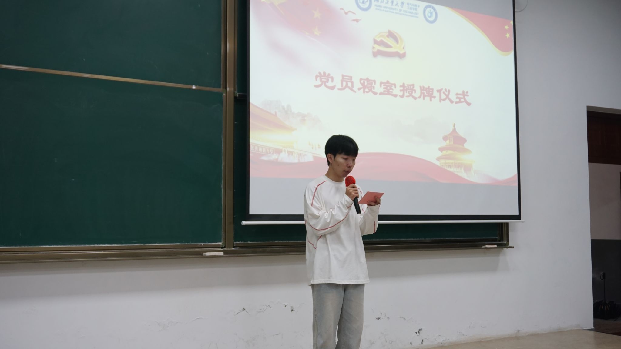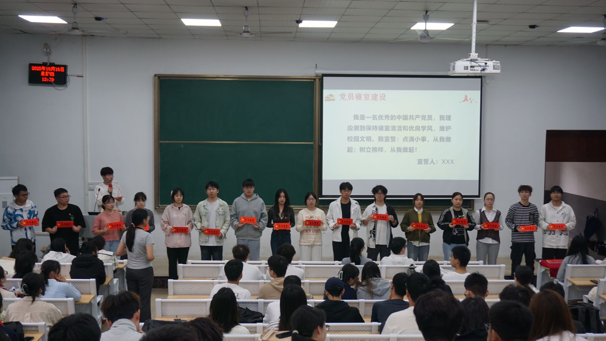 宣誓后,刘筱老师为新发展党员寝室授牌,明确党员寝室需成为文明建设标杆。在九月优秀寝室表彰中,督察部部长朱锦程宣读名单,郑锲老师为获奖寝室颁奖,优秀寝室代表赵万佳淑慧分享寝室建设经验,倡导共建文明环境。