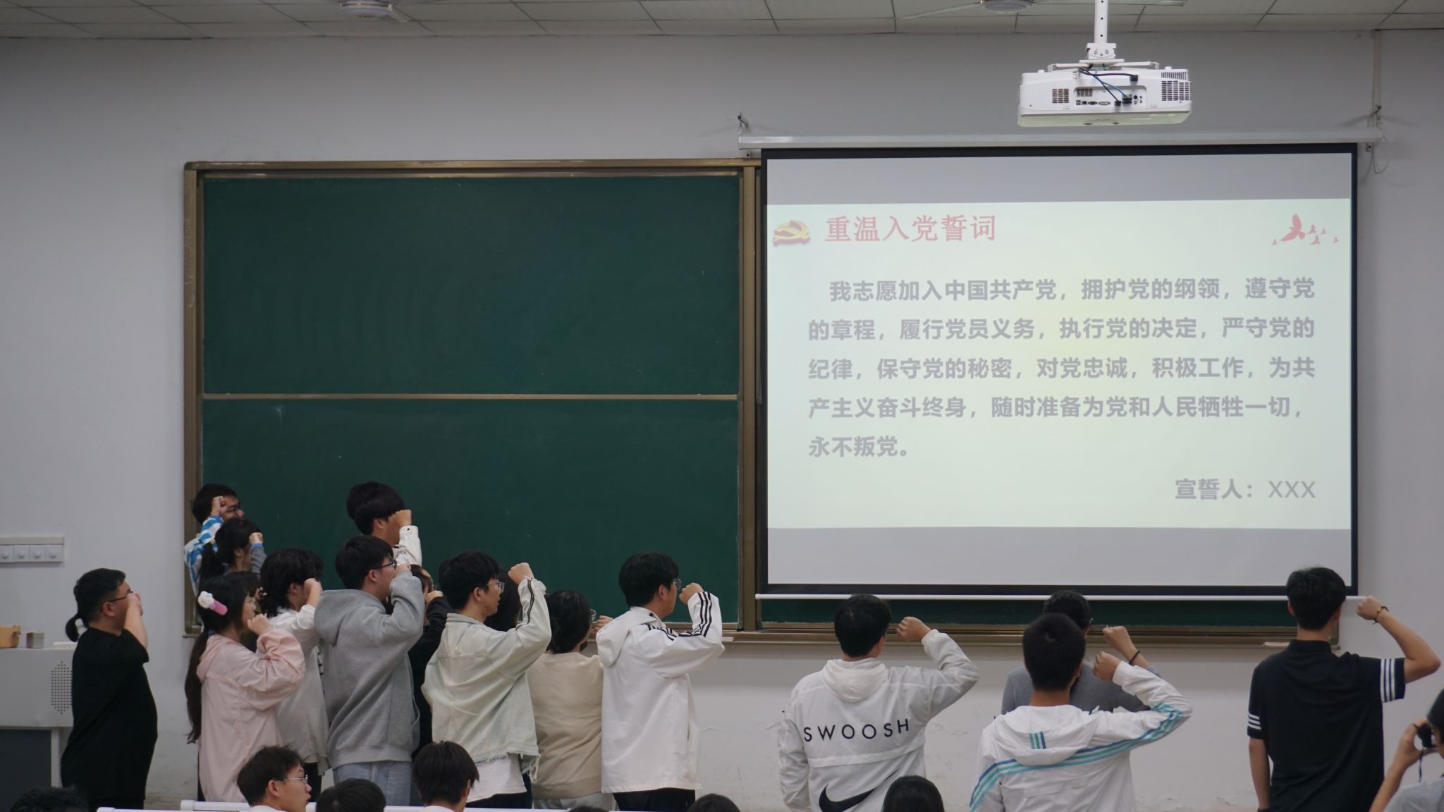 活动分七大环节有序开展:首先,学生党支部代表陈锦嵩宣读新发展党员名单,刘筱老师为新发展党员派发党徽;随后,冯子翔带领全体学生党员重温入党誓词,黄贝尔带领新发展党员宣誓,铮铮誓言彰显党员信念。