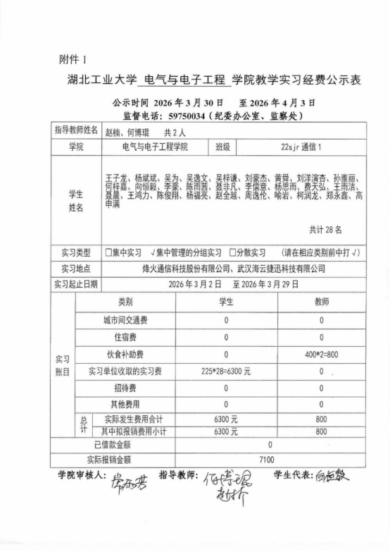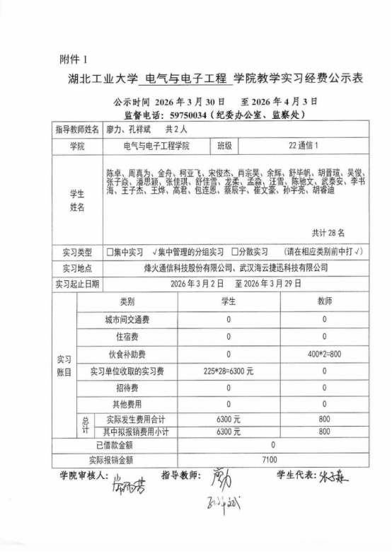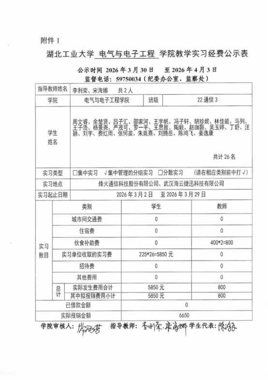 根据校教务处下发的“关于印发《湖北工业大学本科教学实习经费管理办法》(湖工大教〔2023〕106号)”文件精神,本次实习经费遵循以下使用标准:市内实习学生每人225元,指导教师每人每天20元(最多按20天计)。各班级实习经费实际支出情况详见附件:《湖北工业大学电气学院实习经费公示表》。公示时间为5个工作日:2026年3月30日至 2026年4月3日。公示期间,广大师生可以通过电话、信函、网络等方式向学院教学办公室反映公示事项的有关情况。反映情况要实事求是,提倡实名反映,以便了解核实。