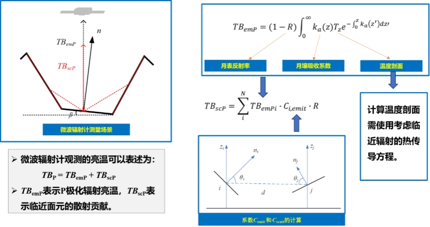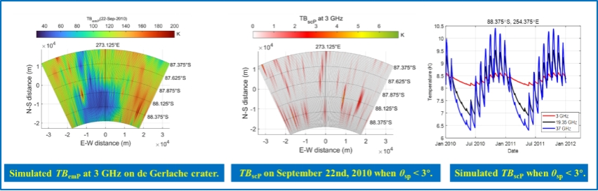 月球极区永久阴影区由于潜藏丰富的水冰资源,一直以来都是研究的热点。为了探明月球水冰的分布,首先需要获取永久阴影区的热特性。永久阴影区表面的热辐射可通过红外等手段获取,但更深层月壤的热辐射特征则需要采用微波探测的手段。由于永久阴影区位于极区撞击坑内,地形起伏变化大,分析月表热辐射特性需要考虑地形的影响。目前的微波热辐射模型主要是针对地形坡度、粗糙度等进行了分析,未考虑临近面元的散射,因而需要进一步发展微波热辐射模型。论文针对极区微波辐射模型开展研究,取得的主要成果为:1)发展了适用于月球极区微波辐射探测的亮温模型,提出利用Ray-tracing方法引入临近表面的相干表面散射,以改进传统微波辐射亮温模型。2)评估了相干表面散射在总亮温中的贡献,当微波亮度温度数据的分辨率相对较高时,例如分辨率为每度4像素时,相干散射对观测到的辐射亮温的影响更为明显。在模拟中,这些增量相对较大的点大多位于陨石坑的倾斜表面,而不是陨石坑的平坦底部。3)分析了嫦娥二号微波辐射计观测中相干面散射的影响。由于嫦娥二号MRM的微波亮温分辨率较低,相干表面散射的贡献小于1 K,可以忽略。因此,从PSR平坦底部区域观测到的微波亮温数据可以作为校准其他高纬度微波亮温的参考。